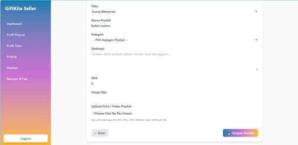 - Kategori : Pilih kategori produk yang sesuai dari dropdown "Kategori" (misalnya: buket bunga, hampers, kartu hadiah, dll).β