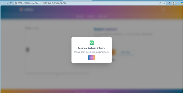 Jika pesanan berhasil dikirim, akan muncul pop-up notifikasi bertuliskan "Pesanan Berhasil Dikirim! Penjual akan segera menghubungi Anda."β