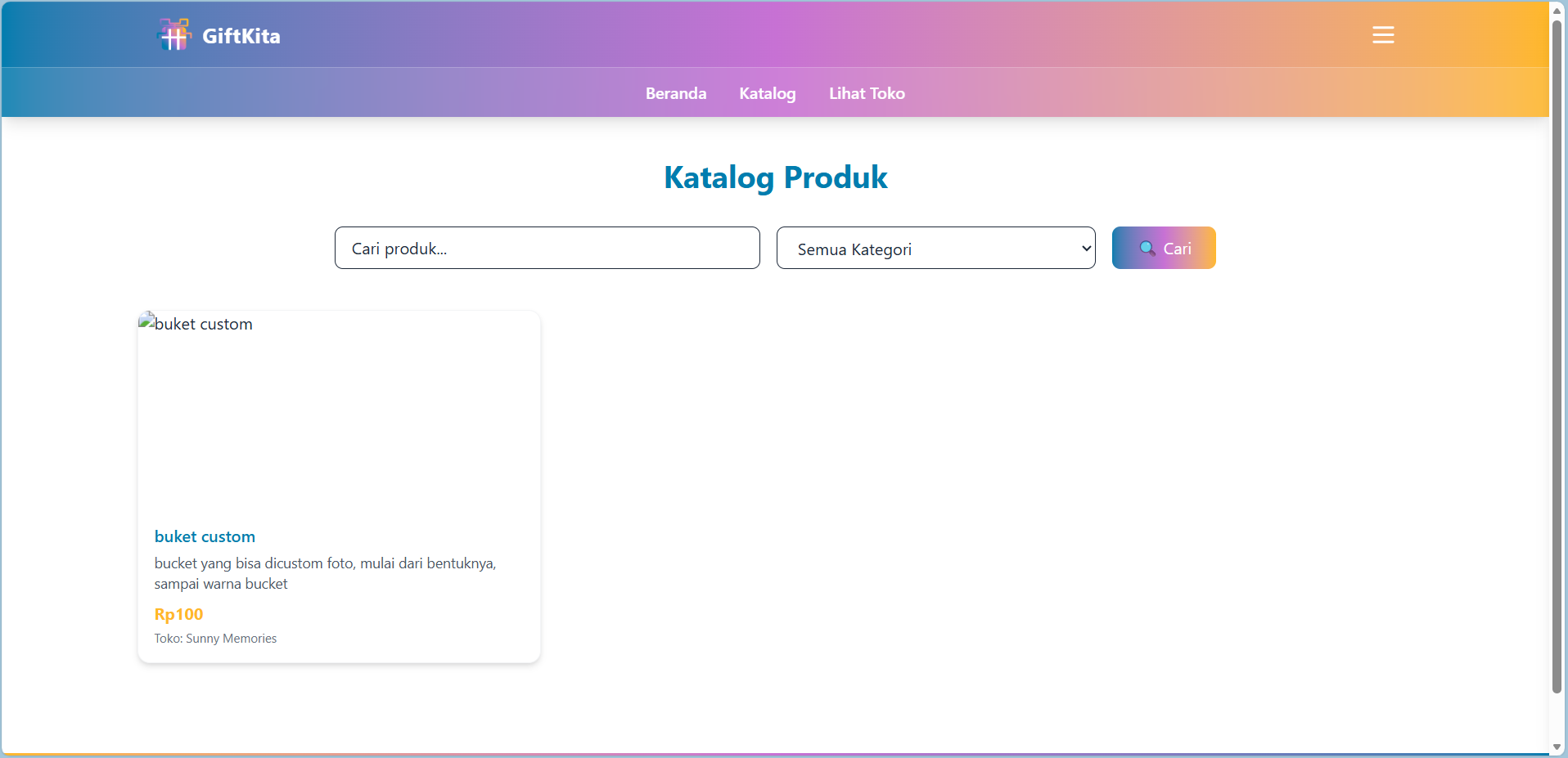 Jika ingin hasil pencarian lebih spesifik, gunakan dropdown "Semua Kategori" untuk memilih kategori produk yang kamu cari (misal: Buket, Hampers, Custom Gift, dll).β