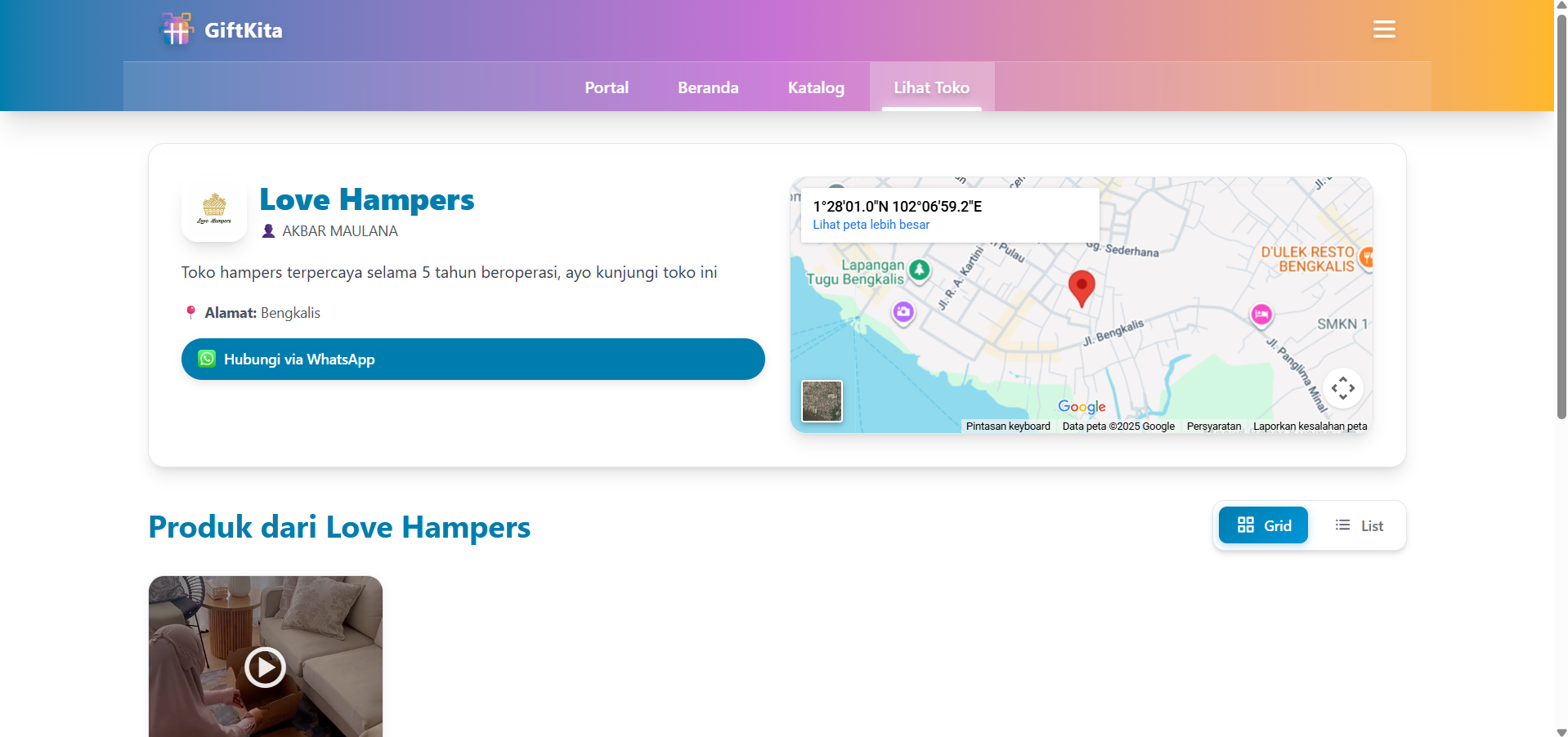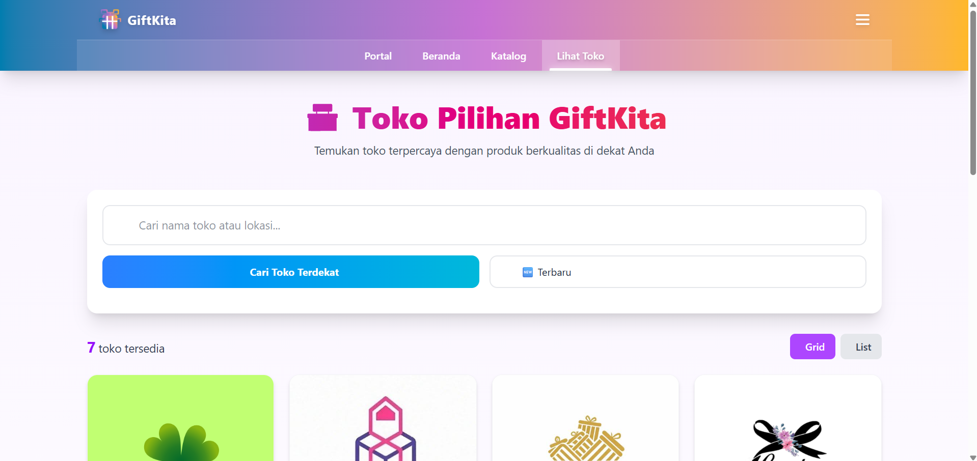 Di bagian atas halaman, klik menu "Lihat Toko" pada navigasi utama untuk melihat daftar toko yang tersedia di platform GiftKita.β